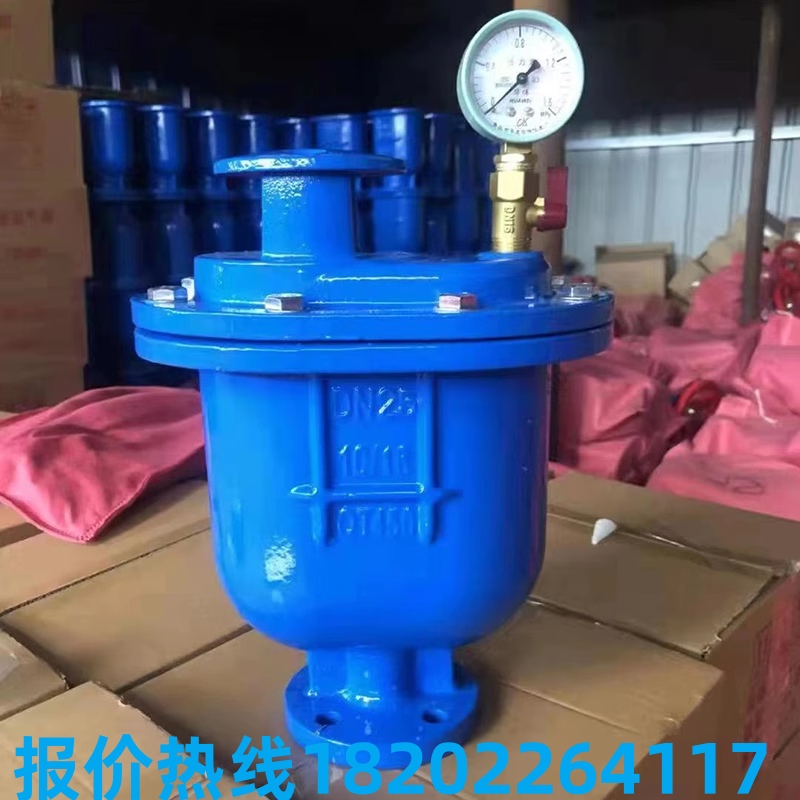 复合式排气阀工作原理是当管内开始注水时,塞头停留在开启位置,进行大量排气,当空气排完时,阀内积水浮球被浮起,传动塞头至关闭位置,停止大量排气;当管内水正常输送时,如有少量空气聚集在阀内到相当程度,阀内水位下降,浮球随之下降,此时空气则由小孔排出。当抽水机停止,管内水流空时,或遇管内产生负压时,此时塞头开启,吸入空气确保管线安全。
